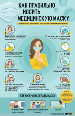Надевать маску следует так, чтобы она закрывала рот, нос, подбородок и плотно фиксировалась (при наличии завязок на маске их следует крепко завязать). Если одна из поверхностей маски имеет цвет, то маску надевают белой стороной к лицу.